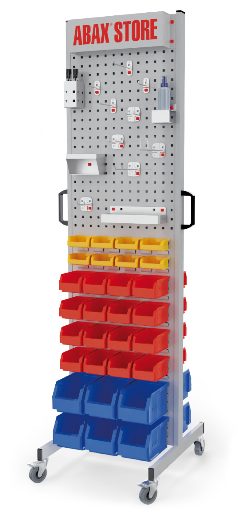 Die ergonomischen Handgriffe und die optionalen robusten Lenkrollen sorgen für zusätzliche Mobilität und durch schnelle und einfache Handhabung trägt das ABAX® STORE-System maßgeblich zur Verbesserung der Ordnung und Effektivität bei.