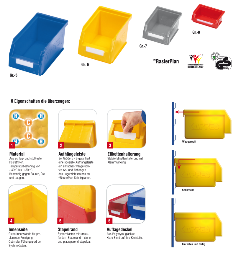 Die System-Kunststoffkästen haben eine geformte Aufhängeleiste, die auch in befülltem Zustand ein AB- und Abhängen ermöglicht. Dadurch kein Verschütten des Füllgutes!